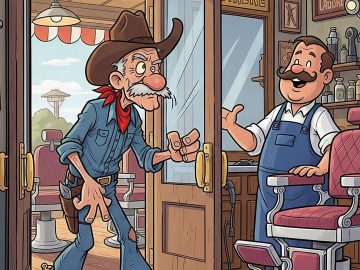 An old cowboy walks into the barbershop for a shave and a haircut, and he tells the barber he can’t get all his whiskers off...