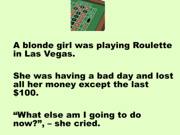 A blonde girl was playing Roulette in Las Vegas. She was having a bad day and lost all her money except the last $100. “What...