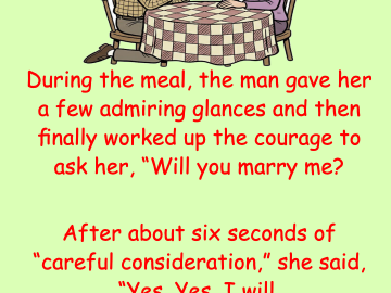 During the meal, the man gave her a few admiring glances and then finally worked up the courage to ask her, “Will you marry me?...