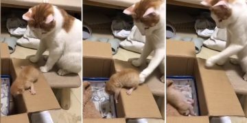 An impatient mother cat helps the kitten to get into a box.