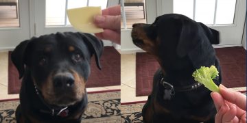 Adorable Rottweiler Just Says “No” to Vegetables and “Yes” to Cheese