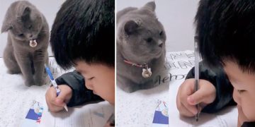 Cat Makes Sure Boy Completes His Homework .