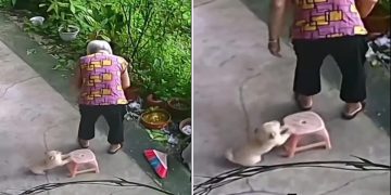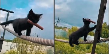 Kitten Amusingly Walks on a Tightrope While Carrying Its Snack.