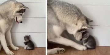 Big Husky Befriends Tiny Kitten And Gives It A Hug. Absolutely Adorable!