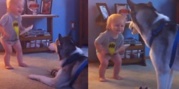 Sweet moment: Cute baby and Husky doggo are ‘talking’ about something.