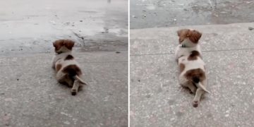 Cute Puppy Contemplate The Rain With His Crossed Legs.