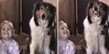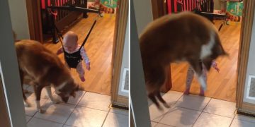 Watch the adorable moment this dog teaches a baby to jump.