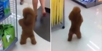 Happy Poodle Hops Around On Two Legs In The Store.