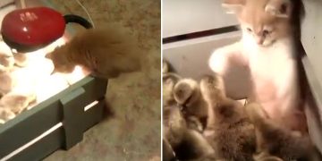 Kitten jumps into box of duckling, is instantly overwhelmed. Cuteness overload!