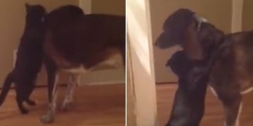 Cat hugs dog as she misses him after being apart for 10 days.