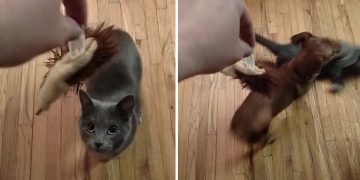 Little Dog Tackles Cat to Steal Hedgehog Toy.