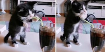 A cute video of the kitten trying to drink soda using a plastic straw.