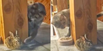 Ninja Cat Pokes Rabbit But Bunny Knows What’s Up.