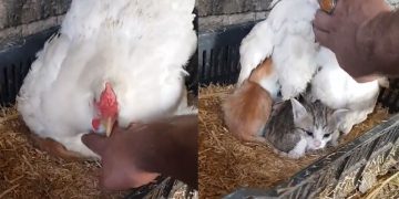 A Guy Captured His Chicken Taking Care Of Three Orphaned Kittens