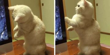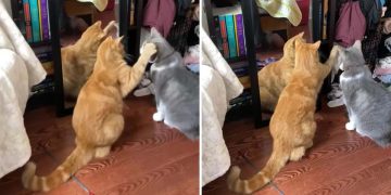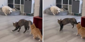 Cat’s hilarious attempt to scare dog ends up startling itself.
