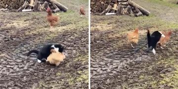 The chickens teamed up to give the cat a farm style beatdown.