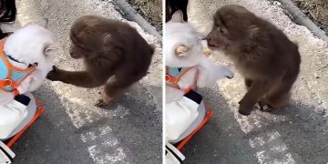 The monkey started kissing while taking the cat’s paw.