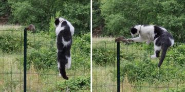 Cat climbs fence to catch mouse and INSTANTLY REGRETS doing so.