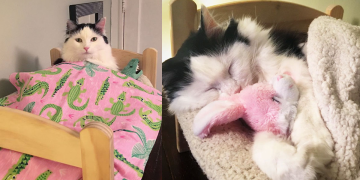 Cat Rescued From Terrible Conditions Now Sleeps In Her Tiny Doll Bed Each And Every Night