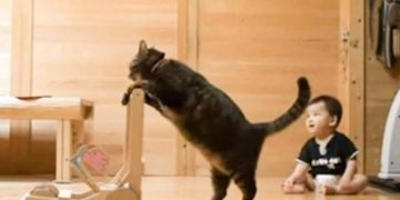 WATCH this awesome cat teach a baby how to walk!