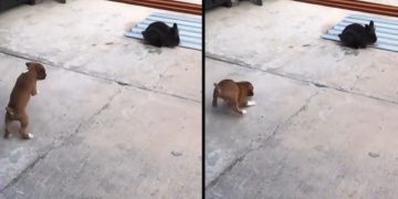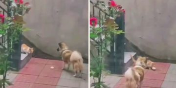 Kind dog gives meat bun to homeless cat after noticing it in garden.