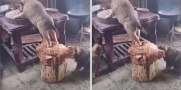 Taking its hidden vantage point from underneath the cabinet, the little thief slowly brings the bowl of food closer while the dog is distracted with food on the floor….and bam!
